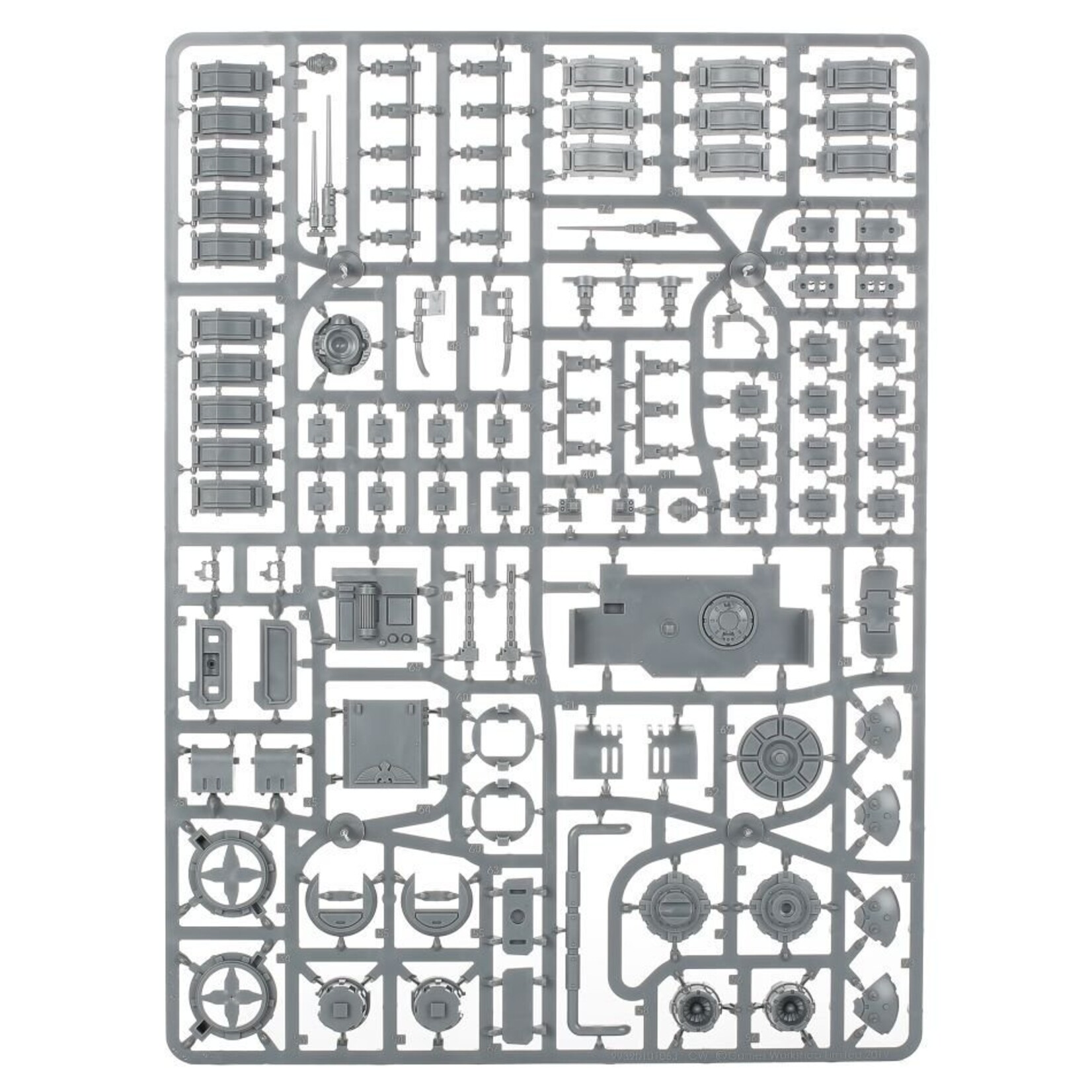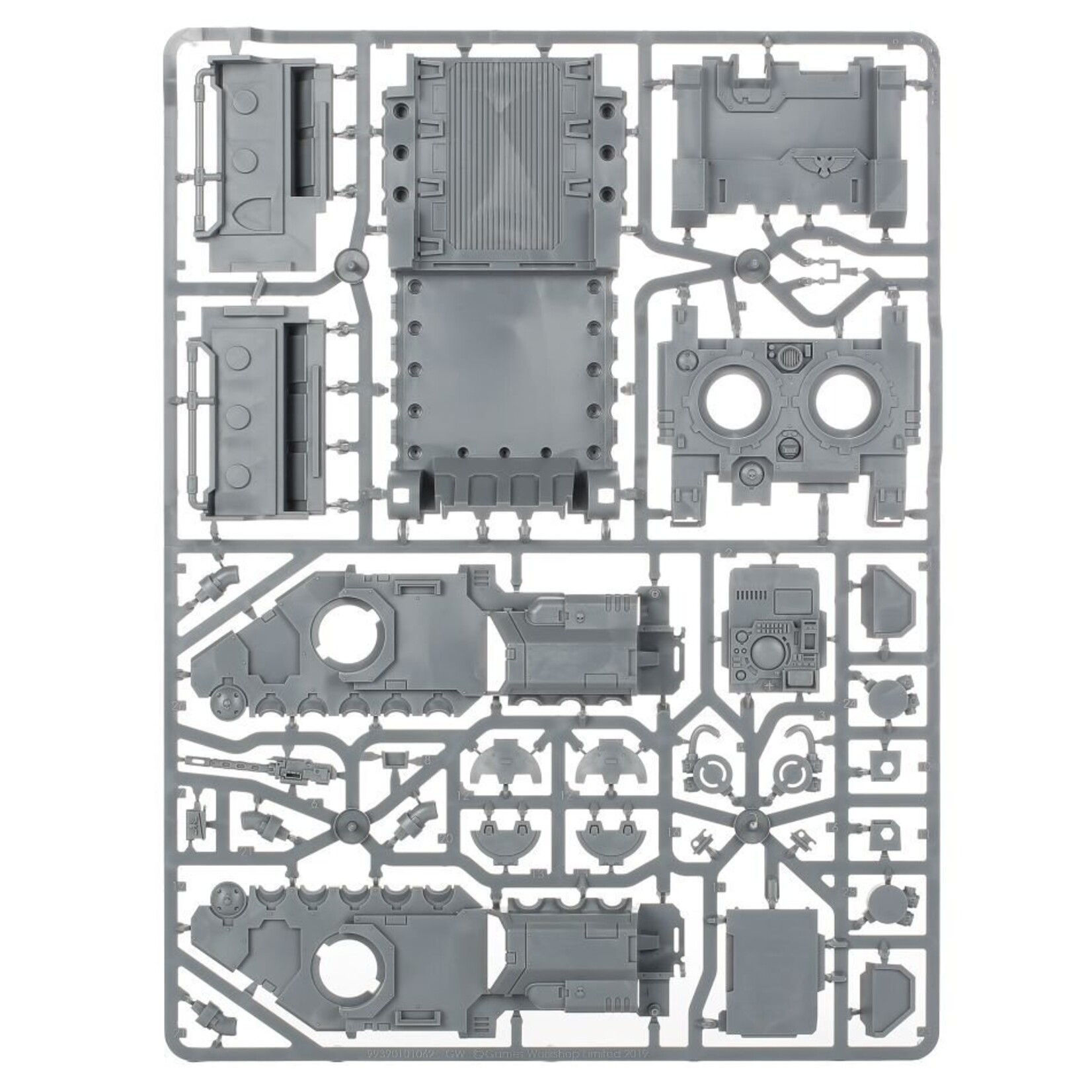 The kit comprises 108 components and included all of the Impulsor's weapons and wargear options. The model comes supplied with a Citadel 100mm round base and clear hover stand upon which to mount it, as well as an Ultramarines Vehicle Transfer Sheet.